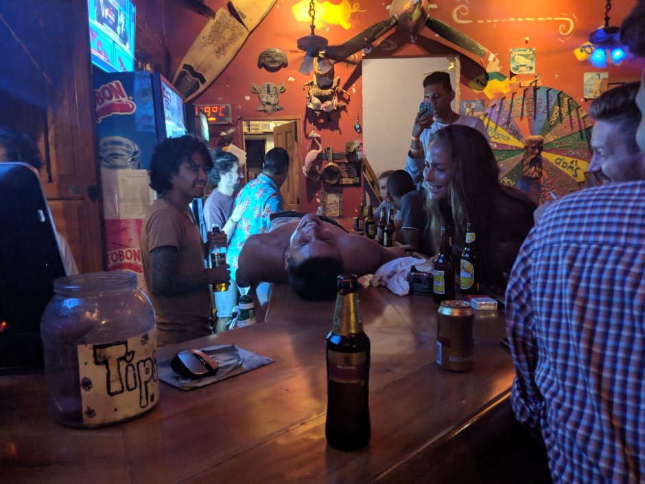 Pretty much the wheel’s goal is to destroy everyone. Some things are just a free drink, but most require you to take a shot or chug a beer or put on a costume or worse. Since it was Sunday night the crowd was calmer which was amazing because at one point I landed on the one that if you are a woman you have to strip and if you are a man you have to put your man parts between your legs and run across the room…it’s the worst one OBI!!! But luckily only one person saw and he and I both quickly moved the wheel one click over to just get a free drink and no one cared.