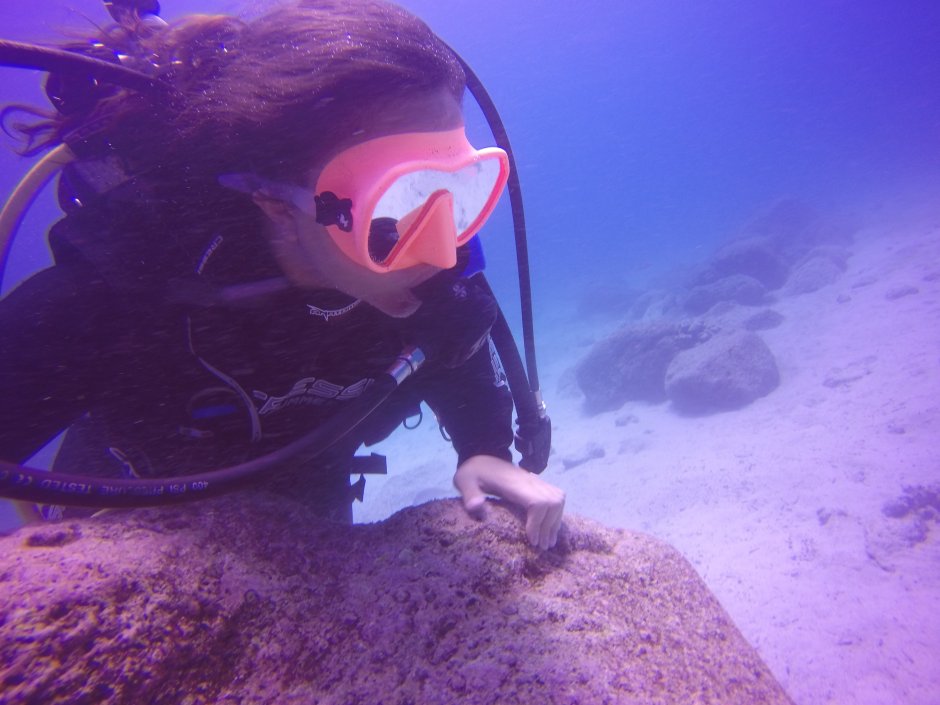 Finally, it was time Obi. Rene helped me get on the side of the boat, which was difficult with all the weight of the tank and the gear, and then he told me to jump in and hold onto the rope on the side of the boat. So…I jumped! And then I was IN the rough waters going up and down…and the water was so cold Obi! But I was wearing a wetsuit so you quickly warm up. Moments later Rene jumped in and made sure all my gear was ready, then he told me we were going to go under and he squeezed a button on my vest to let out all the air and then you just SINK under water! And after a few feet the water is calmer and so much easier to manage than on top of the water. He kept checking all my gear and kept asking if I am okay, which in diving world you have to give the OKAY symbol by putting your thumb and pointer finger together and then spreading your other three fingers apart, like this-.