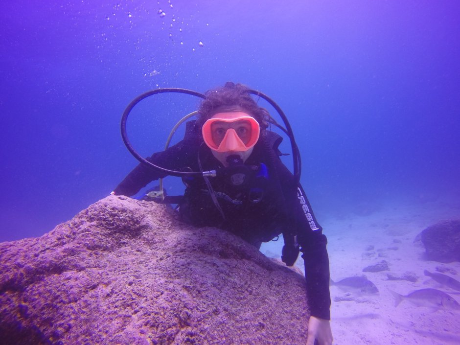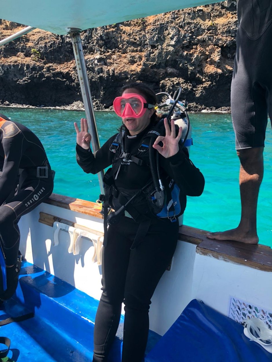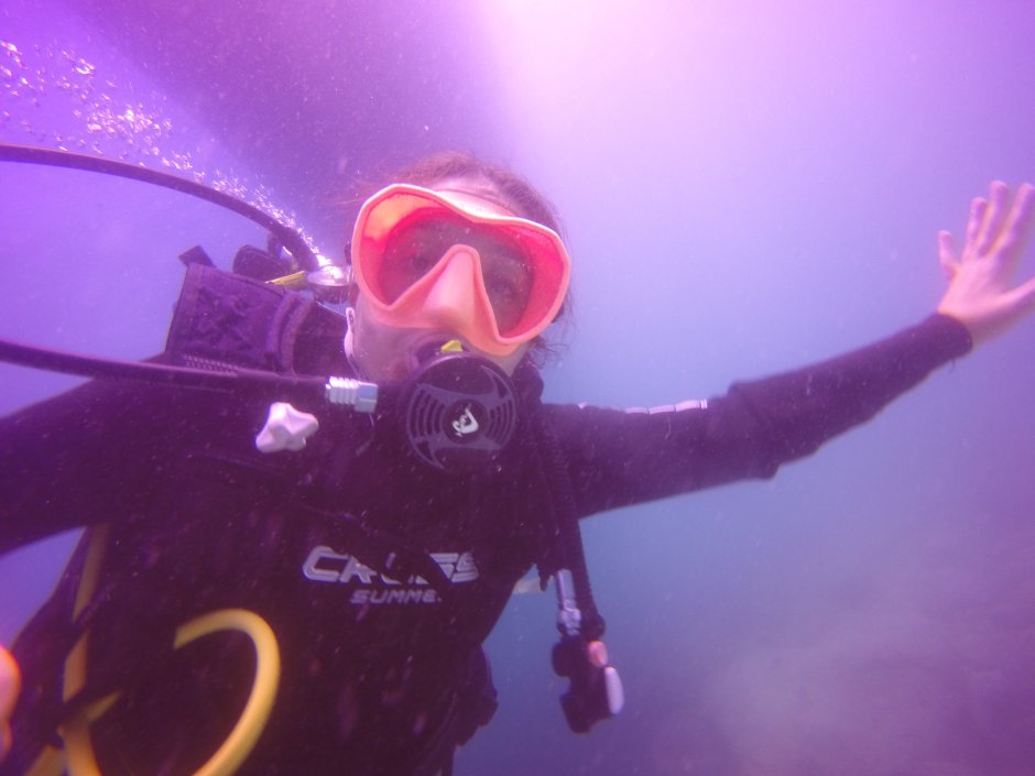 However, I think it is because I have already dived TWICE now, but she had a lot of trouble in the pool. She would come out of the water and kept saying she couldn’t do it (the few tests we had to do). Eventually with Juan and all of us cheering her on, she did the tests!