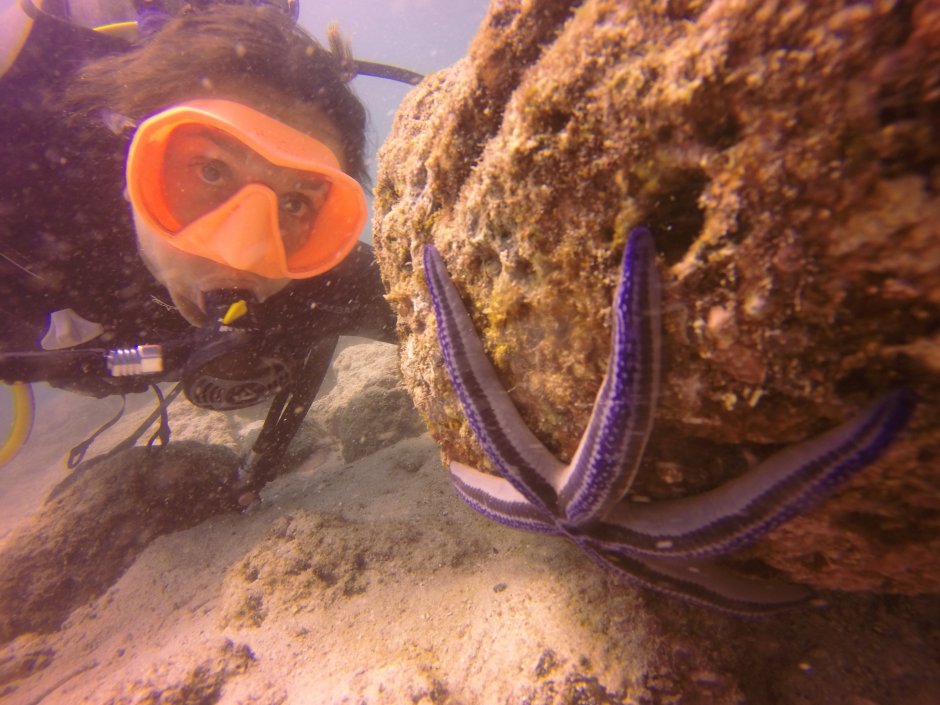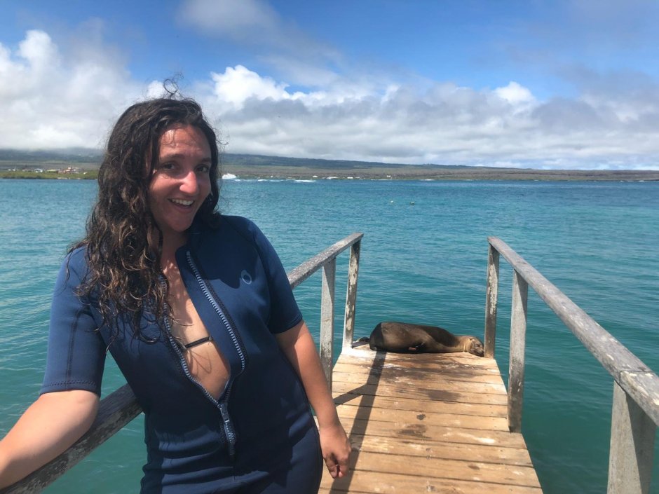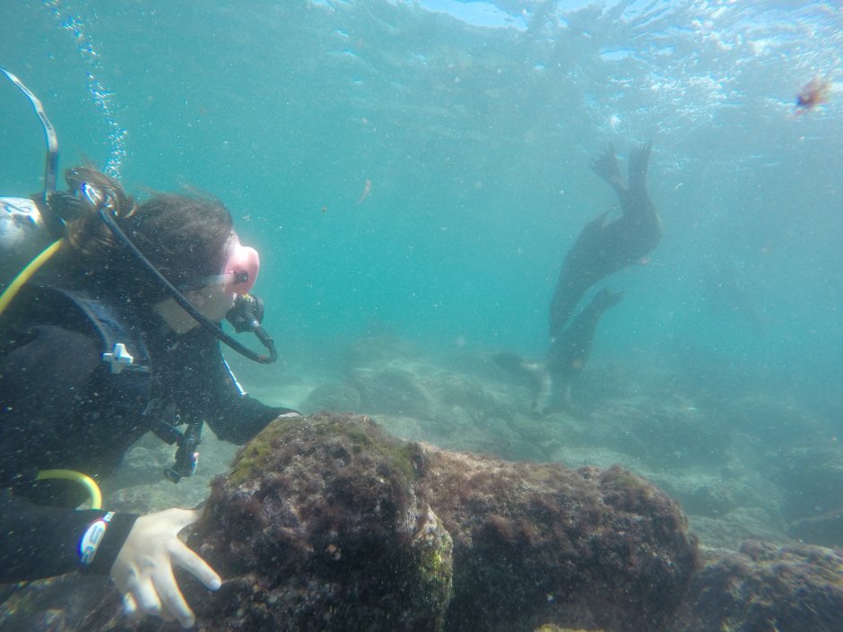 The water today was colder than the last few days and the first part of the dive the visibility was poor and I only saw a few fish. After about 20 minutes trying to find anything…we suddenly saw a few sea lions…and then after we saw a few, more and more began to jump in the water…and eventually there were 7 SEA LIONS Obi! Just swimming with me! The sea lions are very smart and curious creatures so eventually they were swimming RIGHT IN MY FACE studying me and then playing with each other all around me! It was so surreal, I still can’t believe I swam with 7 sea lions!