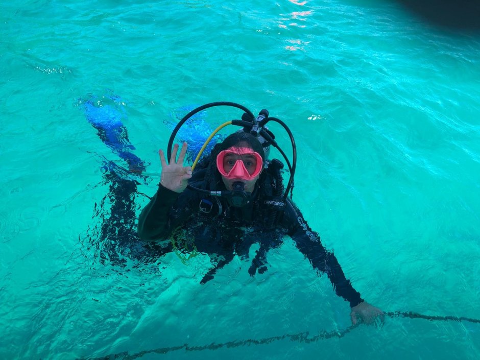 Obiwan Kenobi, the first two tests I could do after a few tries. But the third test was SO HARD for me at first. It is completely counterintuitive at first because you are breathing the whole time underwater with your regulator. This is one of the hardest things I found to get used to. I realized through the pool training that I still breathe through my nose while under water, but with the mask on, you’re just sniffing the rubber and tightening the mask or doing nothing.