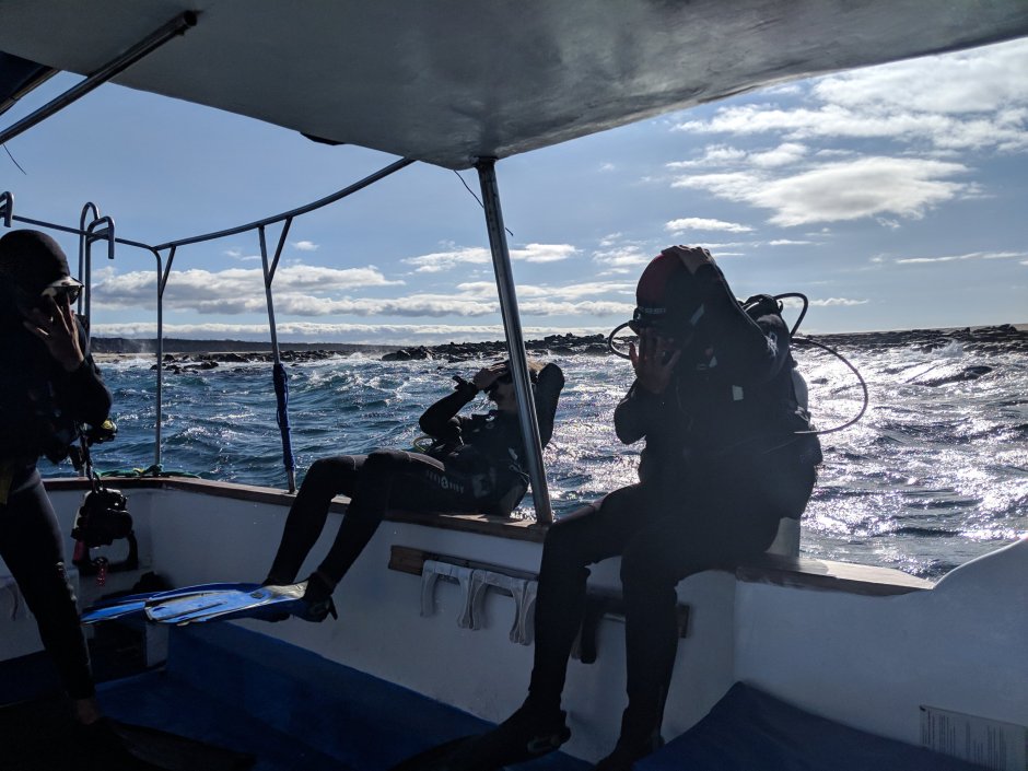 After about 30 minutes riding around the islands we were at Seymore Island, one of the dive sites in Santa Cruz. My dive instructor Rene helped me get my gear on and as I was standing there with all my gear on about to jump into the ocean, I stared to get nervous. Obi, the water is SO ROUGH in the Galapagos, it calms down during ‘high season’ which is when it is warmer and the visibility in the water is better (also means it is much more expensive here!). So as I’m sitting there waiting to go in the water, the waves are splashing violently against the boat and bringing the boat up so high and then down so low.