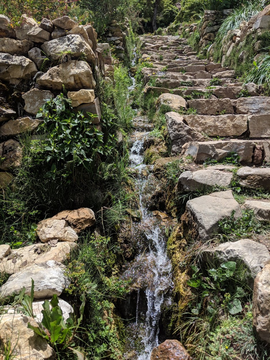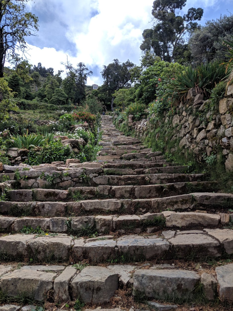 Finally, we were on Isla del Sol! And Obi…it was GORGEOUS there. Cobble stone paths, water running down these beautiful stone drains, flowers everywhere, trees and lush green grass, just WOW. Also, it was sunny!!! On the SUN Island Obi! You would look around at the other islands on the lake and it was all DARK AND CLOUDY AND GLOOMY. But here, on the SUN ISLAND it was SUNNY!!!